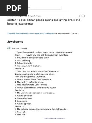Soal reading bahasa inggris pilihan ganda dan jawaban. Contoh soal asking and giving direction pilihan ganda. Jika ada sedang mencari contoh. 50 contoh soal bahasa inggris pilihan ganda dan essay lengkap. From the dialogue we know that … a. Namun lain halnya jika anda harus meminta atau menawarkan bantuan dalam bahasa inggris. They will go to doni's house Modul ini berisikan ungkapan unuk meminta dan memberi petunjuk arah dan lokasi suatu tempat dalam bahasa inggris dengan situasi yang sesuai. Ringkasan materi dan contoh soal bahasa inggris persiapan un . Kali ini akan membahas mengenai asking direction. Asking for and giving directions and locations. Mempelajari materi asking and giving direction dan contoh percakapan 2 orang di jalan dalam bahasa inggris lengkap dengan arti. Terbaru soal pilihan ganda bahasa inggris asking and giving direction .